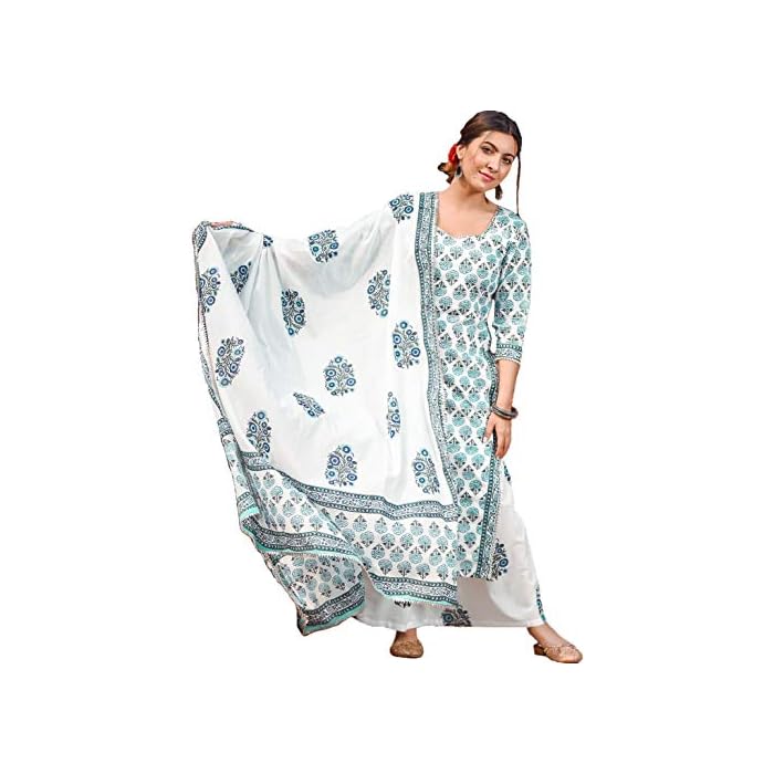 ANNI DESIGNER Women’s Midnight Blue Hand Block Cotton Kurta with Palazzo & Dupatta (Set of 3) (Jaipuri White)