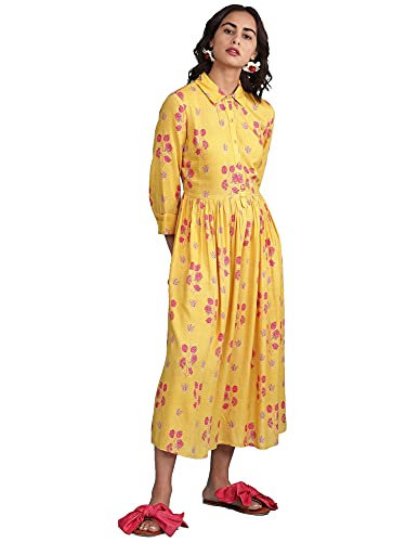 Aarke Ritu Kumar Shirt Collar 3/4 Sleeve Printed Long Dress with Gathers at Waist