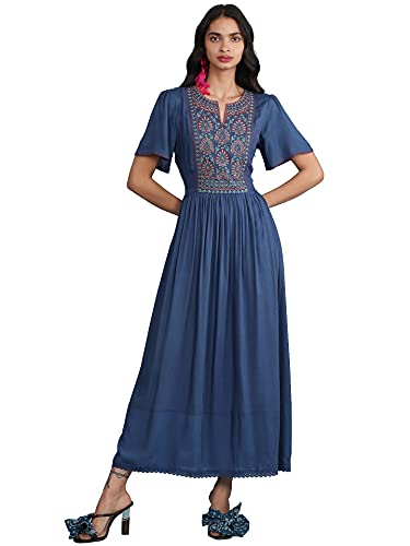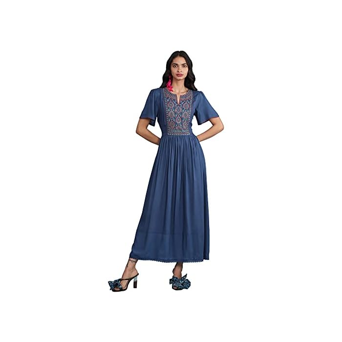 Aarke Ritu Kumar Embroidered Yoke Round Neck Short Sleeve Long Dress with Gathers at Waist