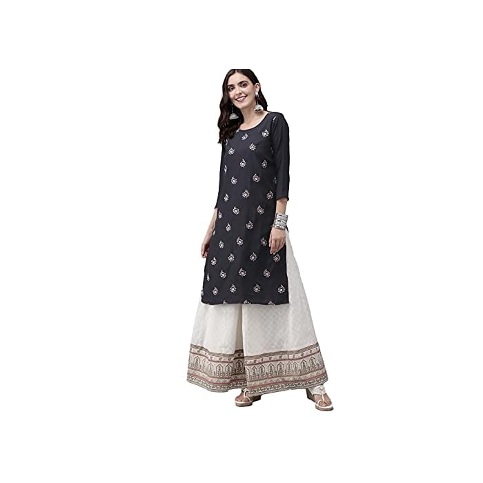MIMOSA Women Navy Blue Floral Embroidered Straight Kurta