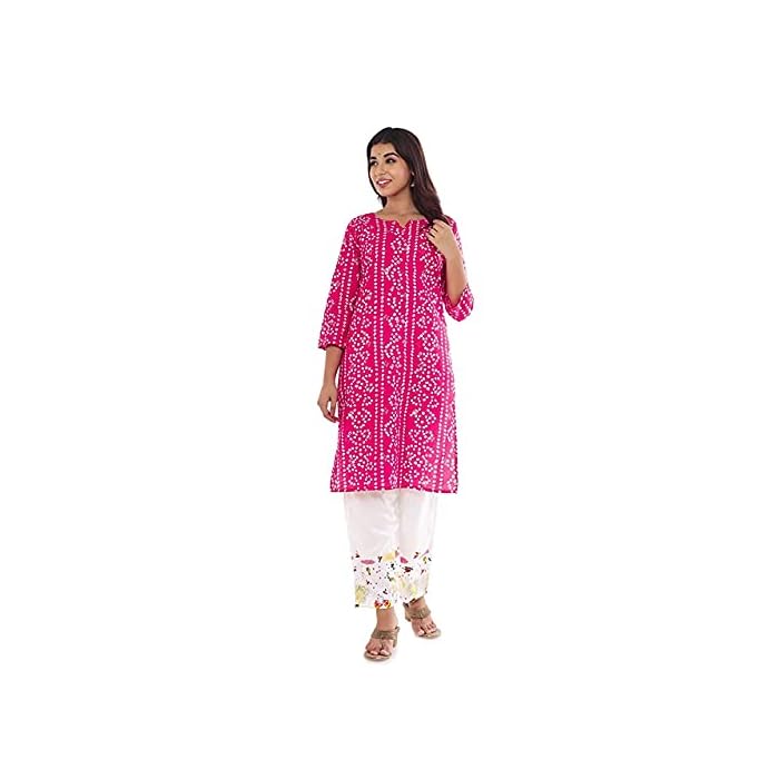 Mamta Fashion Women’s Latest Jaipuri Rajasthani Cotton Printed Kurti Knee Length Straight 3/4 Sleeve Primary Colour White/Secondry Pink Kurti