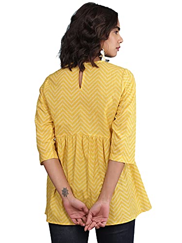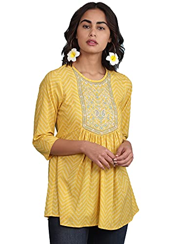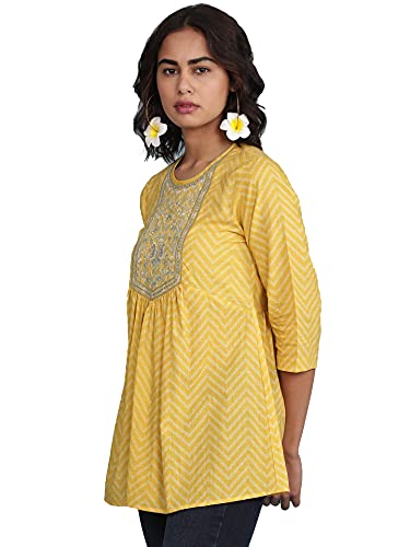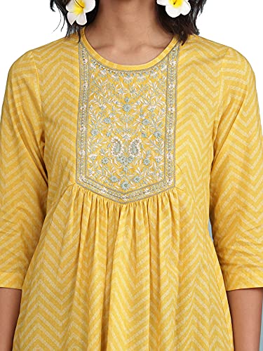 Round Neck Embroidered Yoke 3/4 Sleeve Kurti With Gathers At Waist