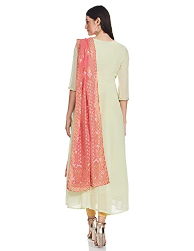 This set has a green round neck kurta with floral embroidery detail, solid tights and printed dupatta.