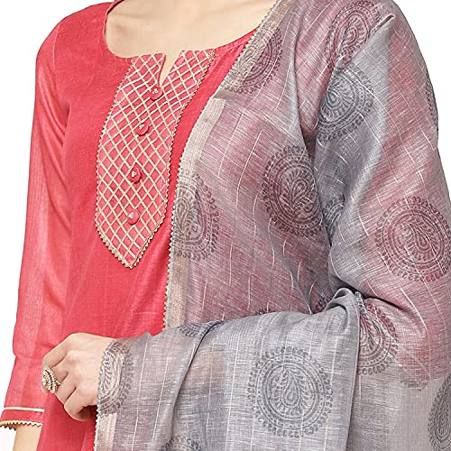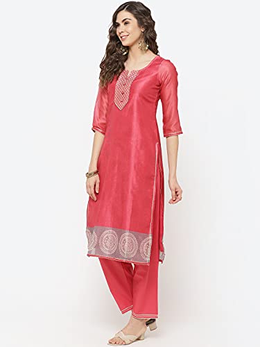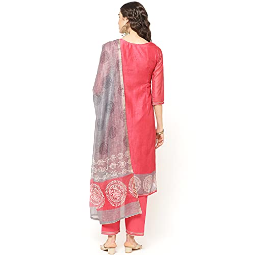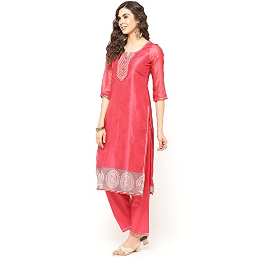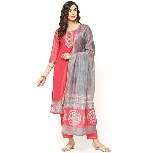Dry clean only, cool iron on reverse of garment three quarter sleeve red poly cotton straight suit set comprising a round neck printed and embellished kurta with 3/4 sleeves combined with churidar and dual toned dupatta .The model (height 5’6″) is wearing a size 34