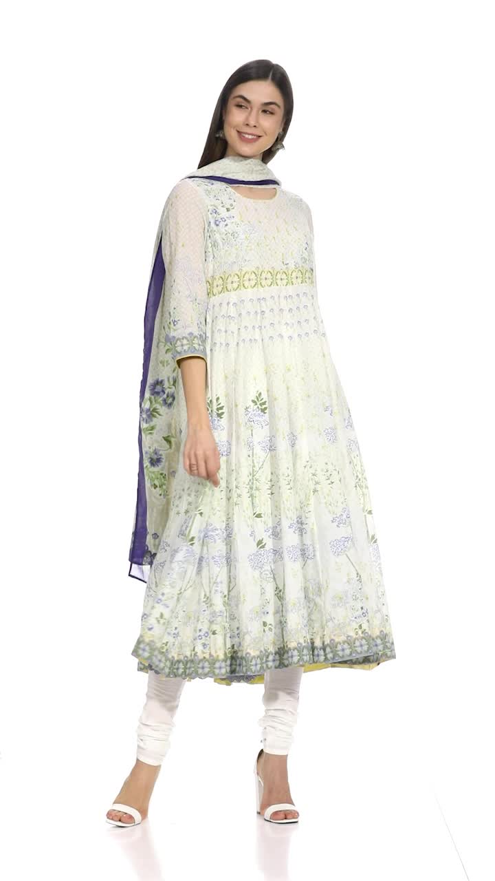 Looking for a chic summer suit-set? Here we got you this beautiful set which comprises an Anarkali kurta, churidar & printed dupatta; Crafted in finest cotton, this suit set assures a comfortable day wearing it