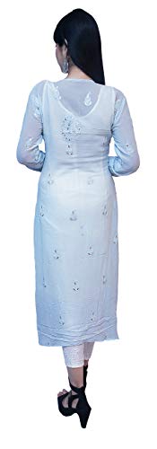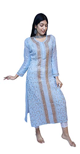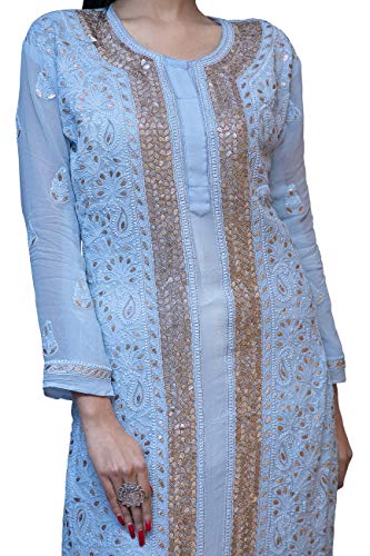 This anarkali is a unique mixture of Chikankari and mukesh work hand dyed with natural colours giving it a light blue shade. The Mukesh patta starting from nech extending througout the length of the kurta is inspired by mughal princess noorjahan’s zanana collection.Completely filled with chikan kari and mukesh work this full kurti is the epitome of traditional clothing.