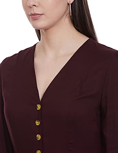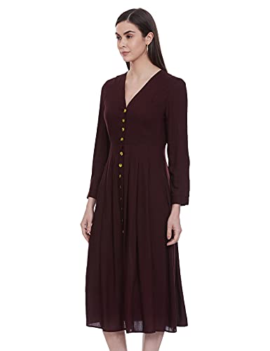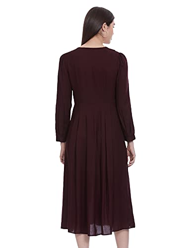 Burgundy solid woven A-line dress with panelling and gathered detail, has a V-neck, three-quarter sleeves, button closure, and flared hem.