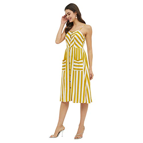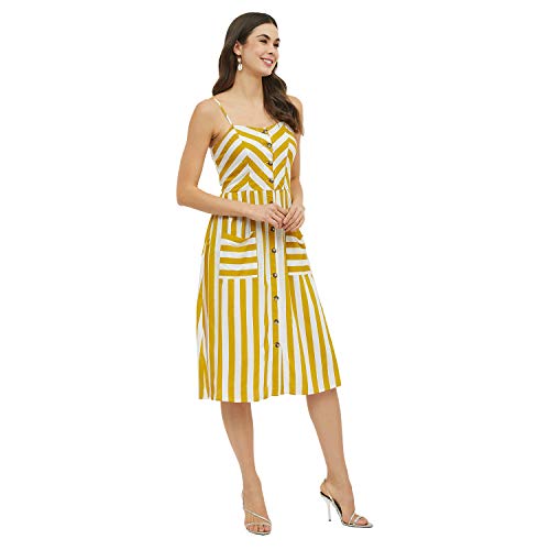 Mustard Printed Woven Dress, has a A-Line, Shoulder Straps, Sleeveless, and Midi