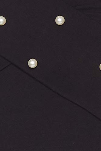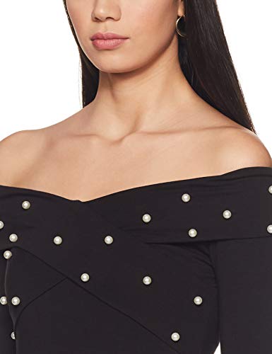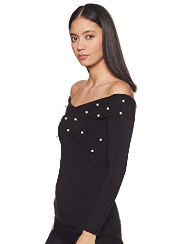 Black solid knitted fitted top with pearl detail, has a stylised V-neck, and long sleeves