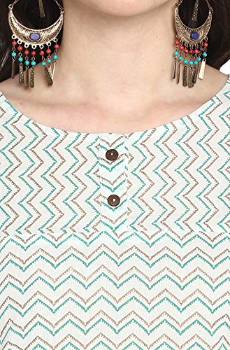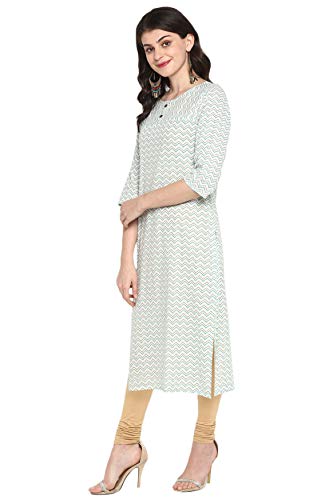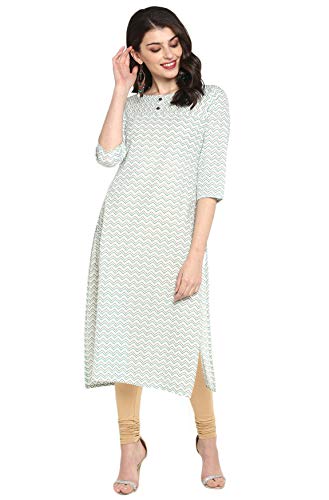 Fall in love with the elegant design and fabic of this stunning kurta from Janasya. The simple round neckline and straight cut adds that old world charm in this classic zigzag/chevron print. The wooden buttons on yoke make this three quarter sleeve kurta easy to wear.Sport this cream piece with studded flats and minimal jewellery for a simple yet classic evening ensemble.