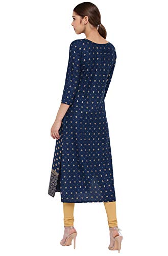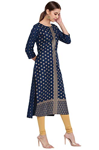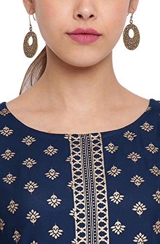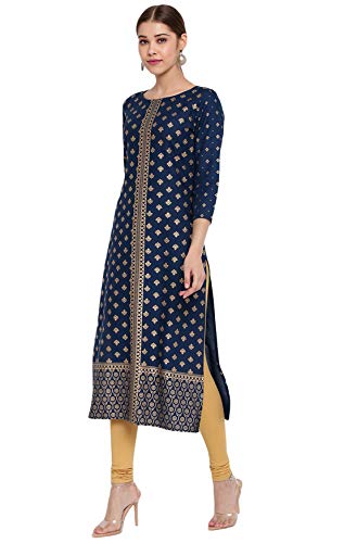 This indigenous dark blue kurta from Janasya is made keeping in mind Indian culture and roots. This rayon kurta has round neckline, three quarter sleeves, straight style and an alluring gold coloured print which enhances the traditional aspect of this kurta making it easy to wear in any traditional event when you want to rock that ethnic diva inside you. Team it with gold jhumkas and leggings to complete the look.