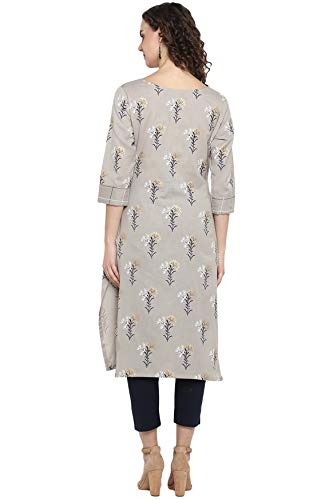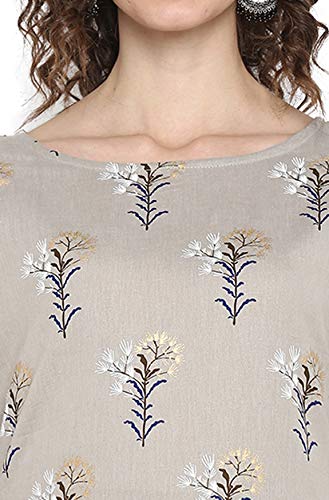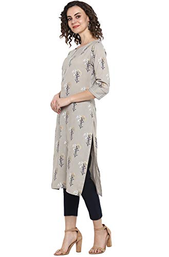 This Grey kurta by Janasya is crafted in cotton slub. Featuring botanical print all over, a boat neckline, 3/4th sleeves and straight silhouette, this calf length kurta offers a comfortable fit. Style this dress with a pair of stud earrings and kolhapuris to attain a casual look.