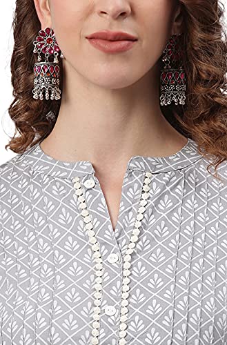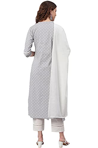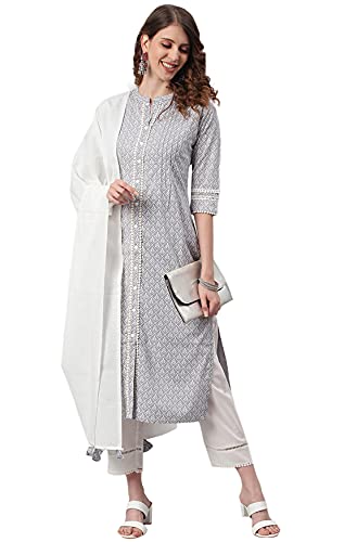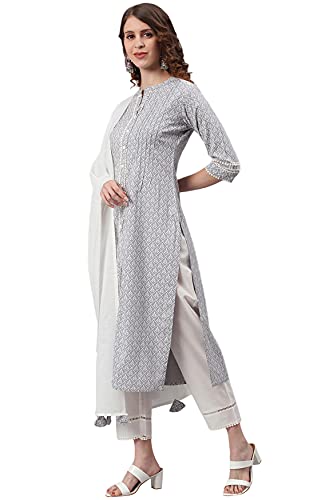 This stunning grey kurta pant set with off-white solid dupatta will be the highlight of your day. Crafted in superior quality rayon fabric, the kurta features a mandarin collar, and three fourth sleeves with cotton lace highlighting the print and the pant is solid with lace hem. Style with a pair of jhumkas and Jaipuri juttis for the perfect ethnic look.