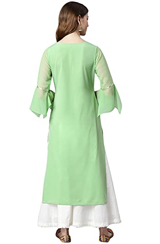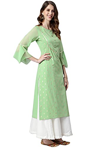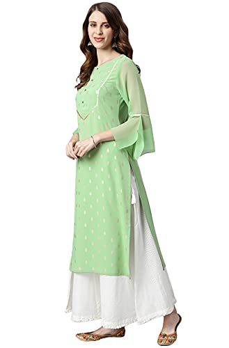 This exquisite kurta from Janasya will help you maintain an elegant look all year long. Made from poly crepe this straight kurta has gota lace on yoke, with floral buttons and georgette material bell sleeves. This piece is a stylish option for any event when teamed with pants and classic flats.