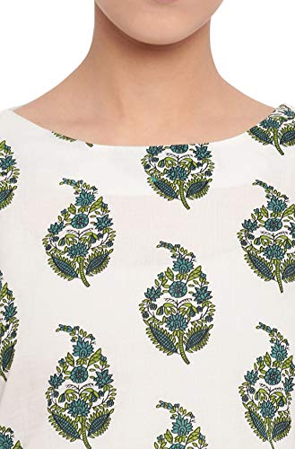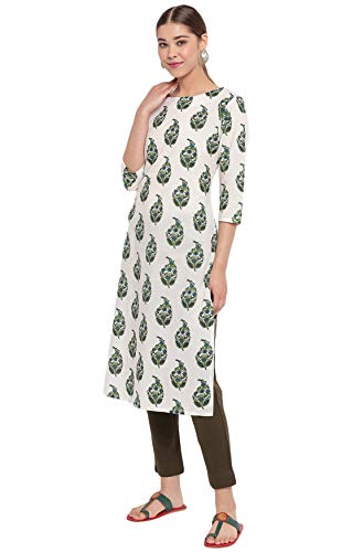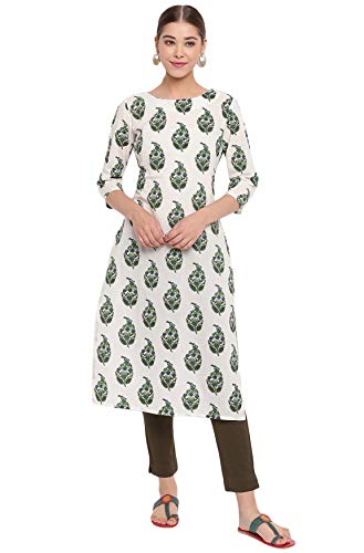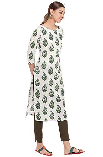 Janasya Women’s Botanical Print Off White 3/4 Sleeve Cotton Straight Casual Kurta