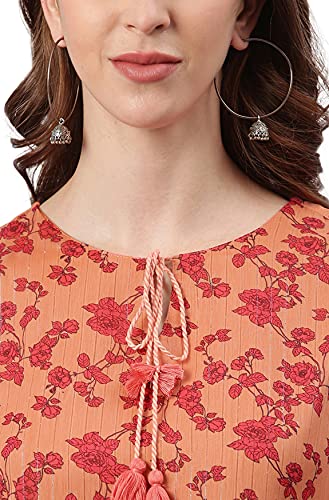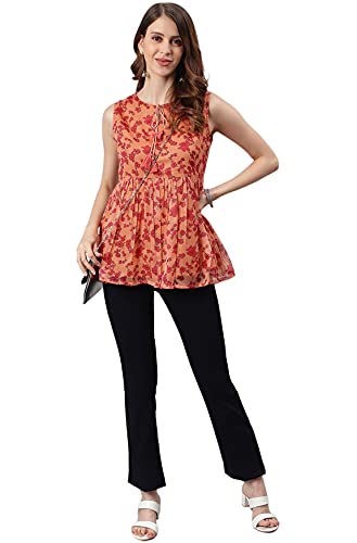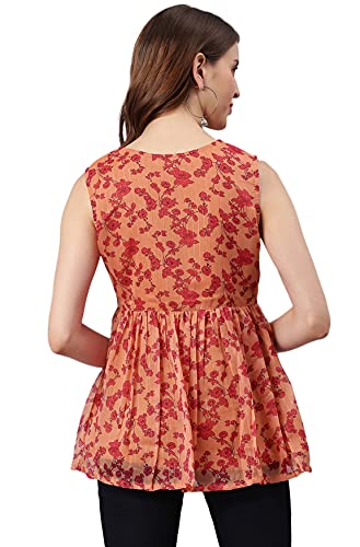 Premium Collection by Janasya. Upgrade your year-round wardrobe staples with this sleeveless top by Janasya. This poly-georgette top has tie-up neckline and rose floral print with gathers on waistline. Match this orange piece with a pair of slim jeans and easy loafers for a fashionable date outfit.