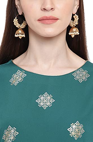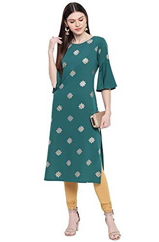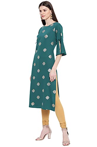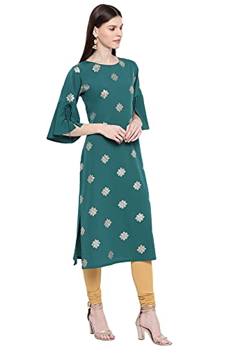 This kurta from Janasya showcases a gorgeous foil print pattern in mixture of gold and silver tone. Crafted in poly crepe, this kurta will make you look flattering from all angles featuring a straight silhouette with bell sleeves enhanced by tie-up, this kurta is perfect to go with beige leggings.