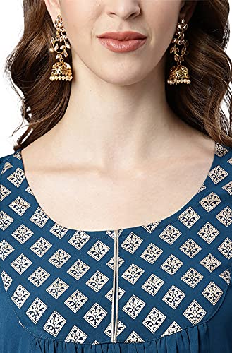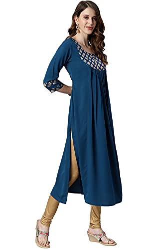 This sophisticated teal and gold kurta by Janasya is perfect for your ethnic wear needs. Feature a gathered design on waist with print on yoke with printed border on 3/4th sleeves hemline, this straight kurta has a touch of moderness to it.