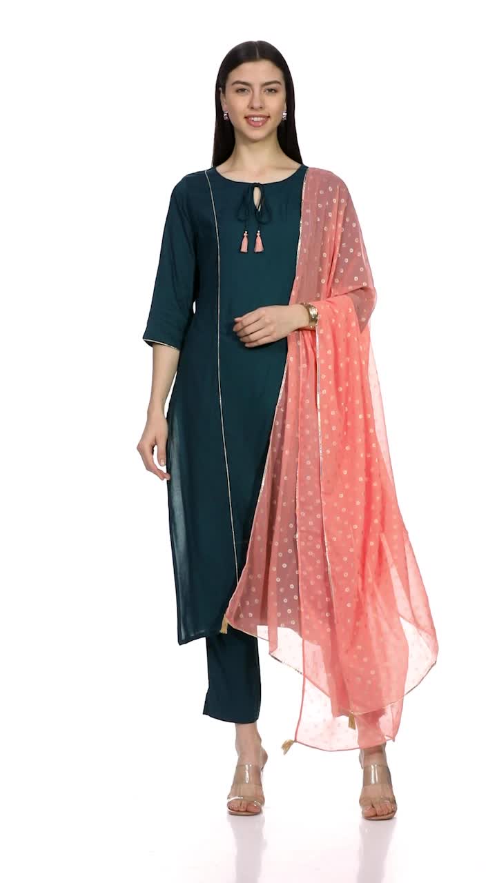 Style: Straight Kurta of length 44″ with 3/4 Sleeve; Pant of length 36″; Dupatta of Length 2.25 Mtr