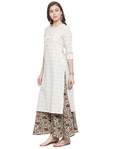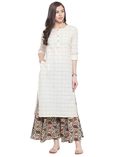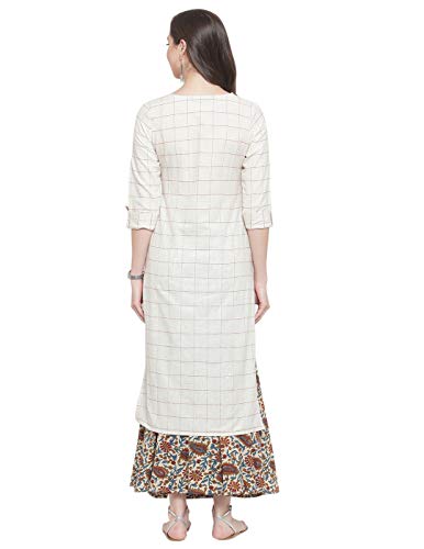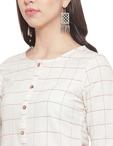 White with red and blue checked handloom straight kurta, round neck with placket and wooden buttons, 3/4th sleeve with cuff and tab, straight hemline.