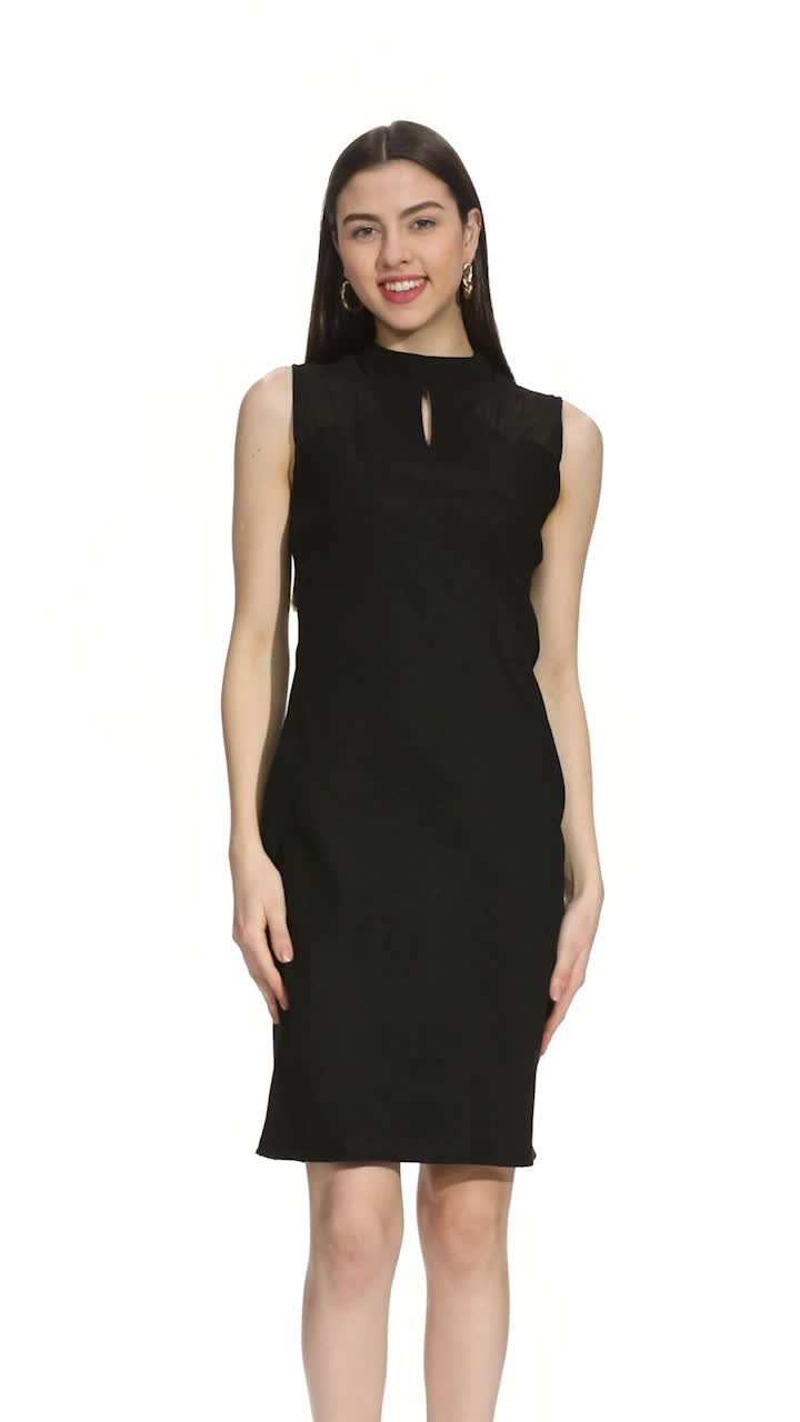 Fit: Slim Fit | Length: Knee-Long | Pattern: Solid | Knit/ Woven: Woven | Hemline: Straight | Lining: No | Style: Bodycon | Neck Type: Banded Collar | Sleeves: Sleeveless | Closure Type: Zip
