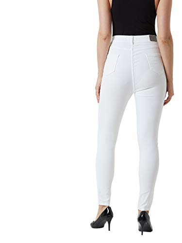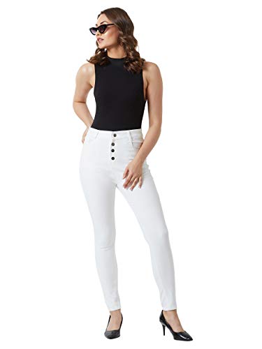 White skinny fit high rise regular length bleached denim jeans, has five pockets and a button fly closure, has a clean look.