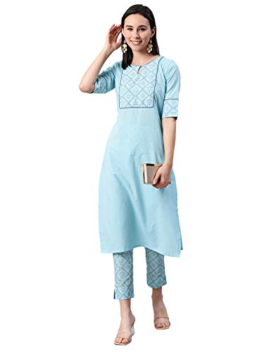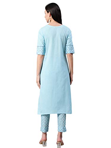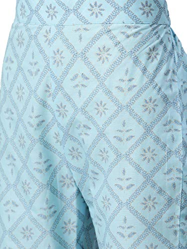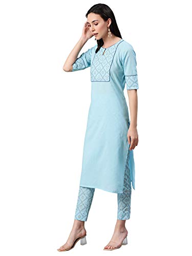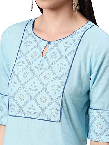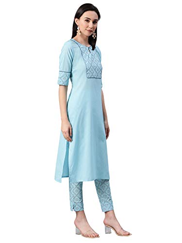 Sky Blue color khadi print cotton kurta has round neck,three quarter sleeve,side slit and straight hem.Sky Blue Color khadi print cotton pant with elasticated back slip on style.