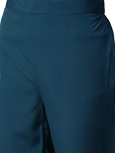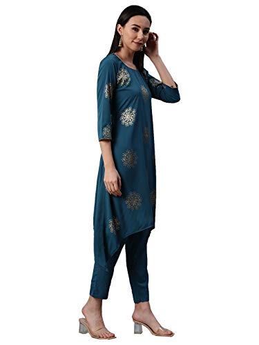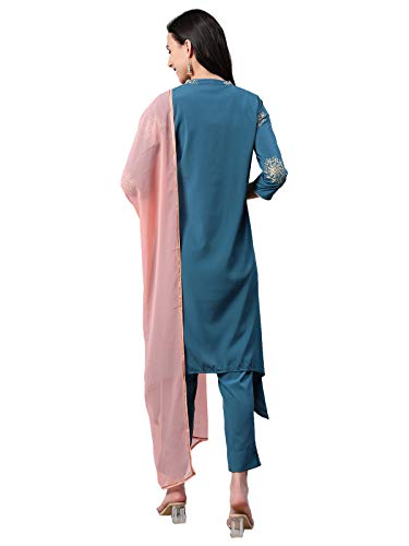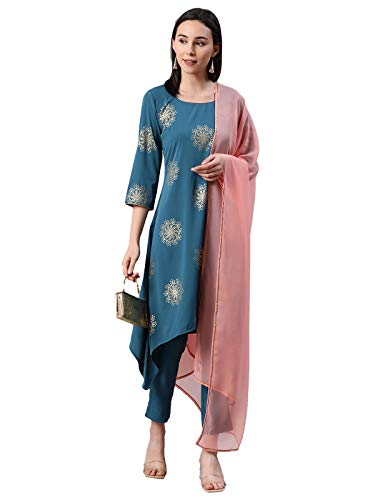 Teal blue color foil print crepe kurta with pant and dupatta has round neck, three quarter sleeve, side slit and straight hem.Teal Blue color dyed crepe pant with elasticated back slip on style.