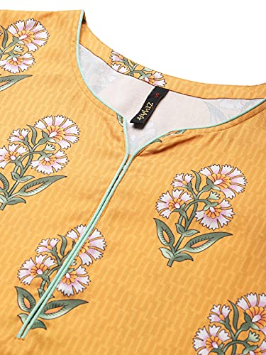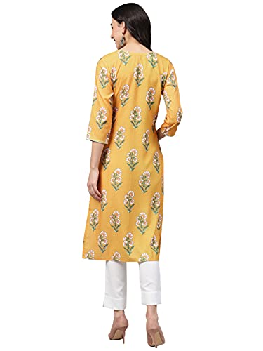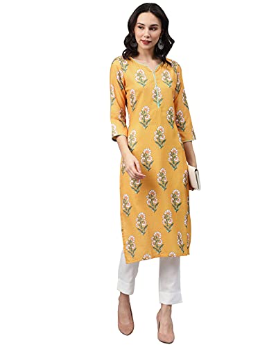 Yellow Color Digital Printed Rayon kurta has round neck,three quarter sleeves,side slit and straight hem.White color dyed rayon pant with elasticated back slip on style.