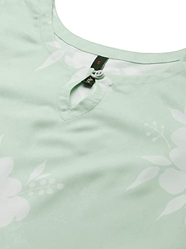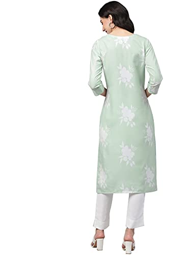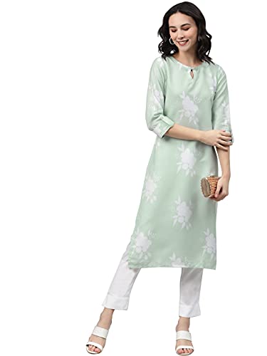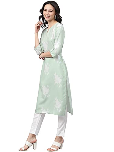Light Green Color Digital Printed Rayon kurta has round neck,three quarter sleeves,side slit and straight hem.